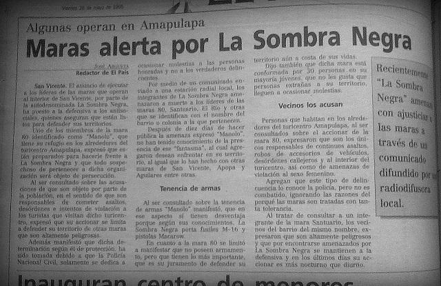 “ Un tribunal salvadoreño decretó ayer la detención provisional de catorce personas acusadas de pertenecer al grupo armado clandestino Sombra Negra (…). También se decretó orden de captura contra un subcomisionado de la Policía Nacional Civil (PNC), César Valdemar Flores Murillo, quien hasta hace pocos meses fue jefe de la delegación de San Miguel y se encuentra prófugo. Entre los catorce detenidos se encuentran tres agentes de la PNC y el resto, en su mayoría, son residentes del barrio Milagro de la Paz, de la ciudad de San Miguel, entre quienes se encuentra un conocido comerciante (…). El supuesto involucramiento de agentes de la PNC en esos hechos ha despertado gran preocupación en distintos sectores de la sociedad salvadoreña, ya que la institución fue creada en los Acuerdos de Paz firmados entre el Gobierno y la antigua guerrilla en enero de 1992”.